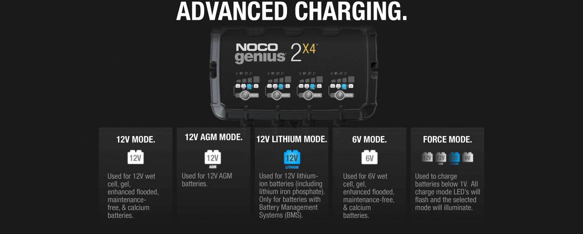 Introducing the all-new GENIUS2X4, making it one of our most powerful, highest-performing, energy-efficient, and compact charger yet. The GENIUS2X4 is a 6-volt and 12-volt four-bank battery charger, battery maintainer, trickle charger, and battery desulfator. It's rated at 8-amps (2-amps per bank) for all types of lead-acid and lithium-ion batteries, including flooded, gel, and AGM, as well as marine and deep-cycle batteries.