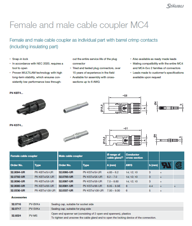 Female and male cable coupler as individual part with barrel crimp contacts (including insulating part) • Snap-in lock • In accordance with NEC 2020, requires a tool to open • Proven MULTILAM technology with high long-term stability, which ensures consistently low performance loss throughPV-KBT4... PV-KST4... • Also available as ready made leads out the entire service life of the plug connector • Tried and tested plug connectors, over 15 years of experience in the field • Available for assembly with cross- sections up to 6 AWG • Mating compatibility with the entire MC4 and MC4-Evo 2 families of connectors • Leads made to customer’s specifications available upon request
